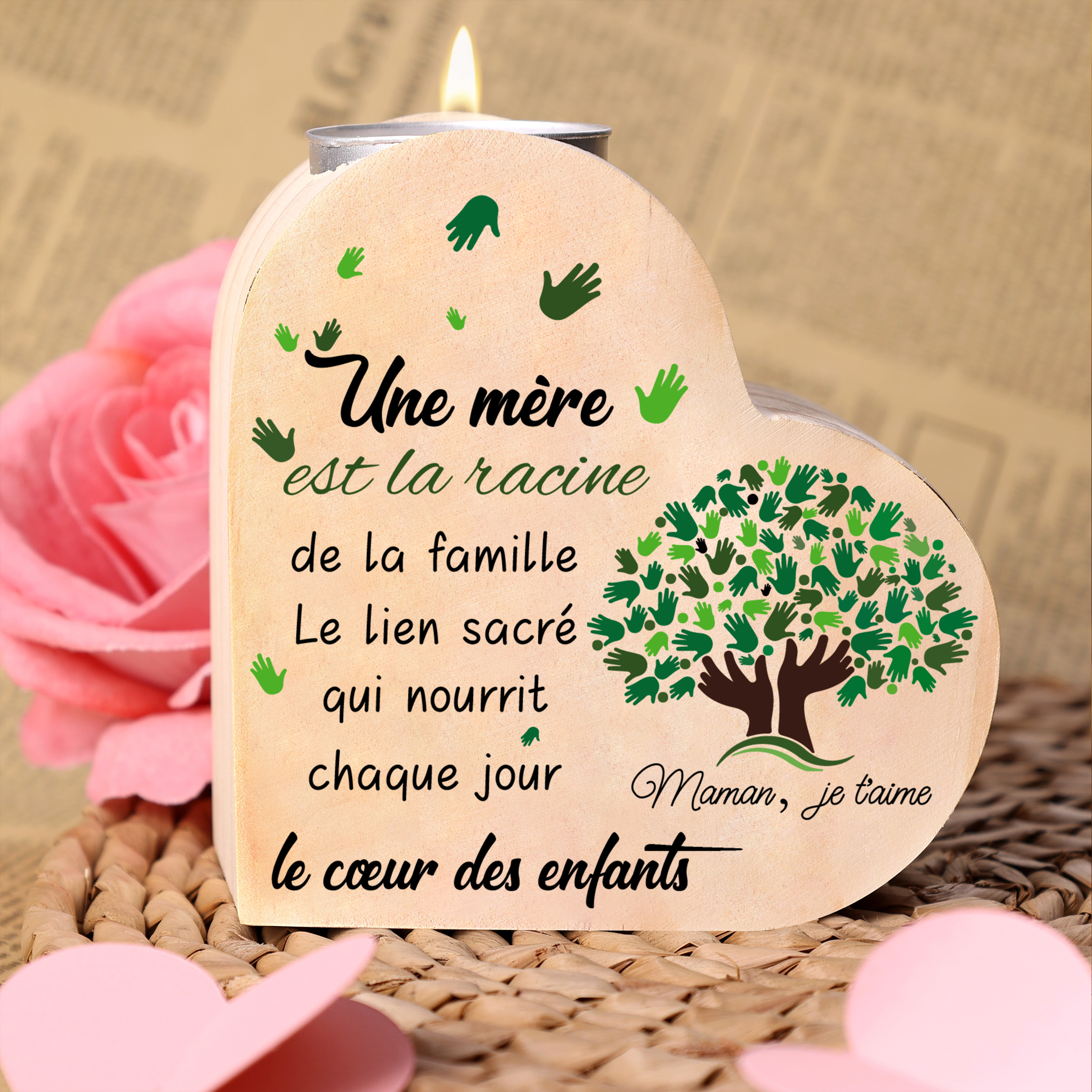 À Maman - Bougeoirs en Bois sans bougie 5 Prénom Personnalisé Cœur