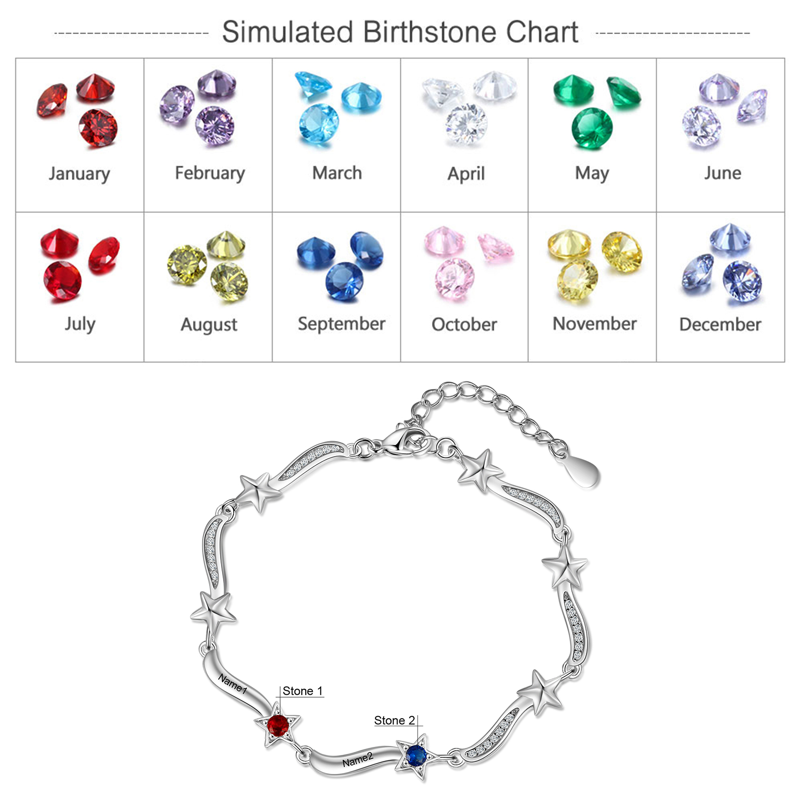 Bracelet étoile 2 Prénom Personnalisé avec 2 Pierre de Naissance