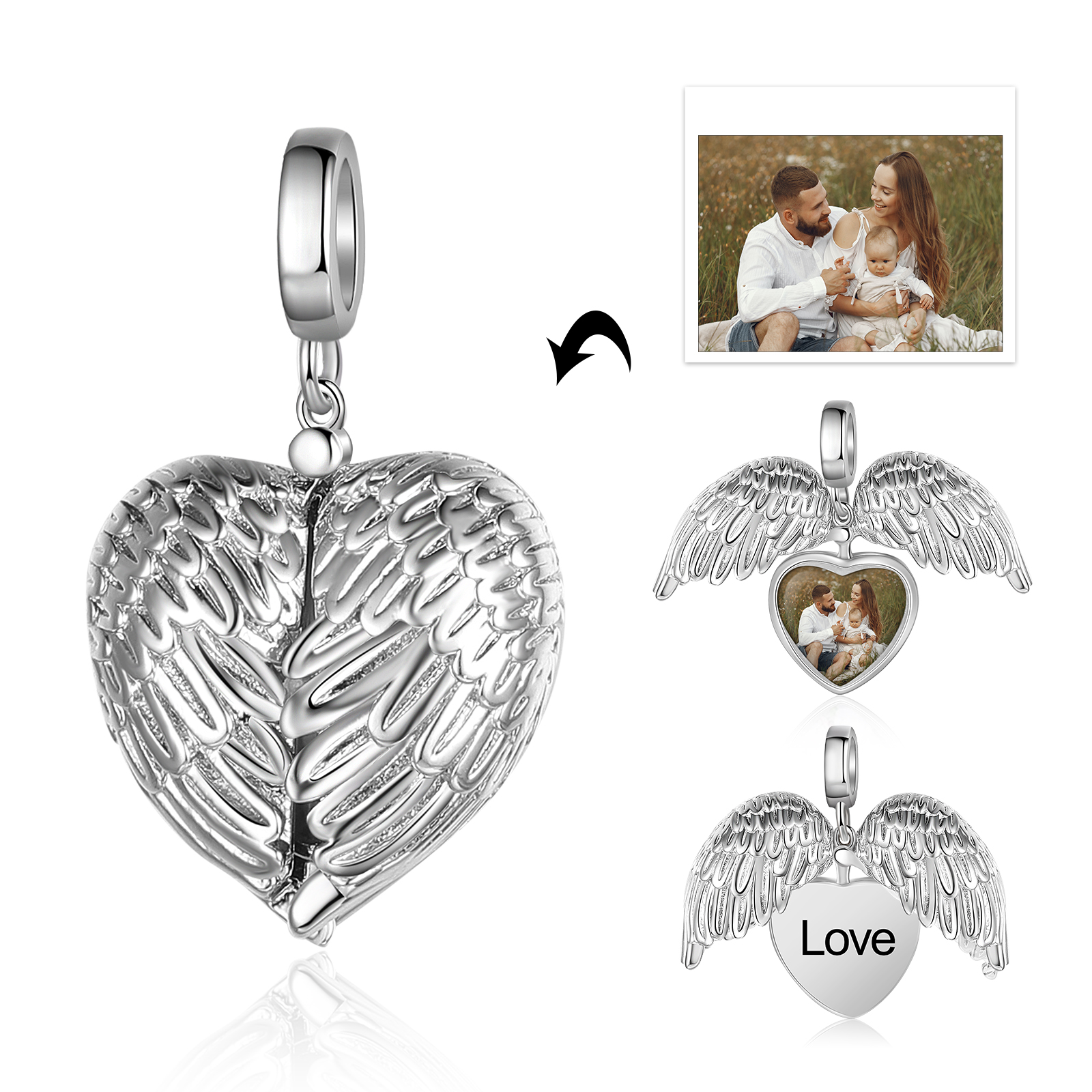 Charm photo Personnalisé Pendentif En forme de Cœur et aile avec texte
