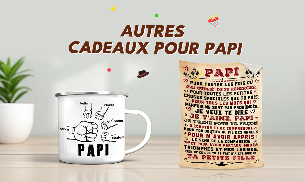 Les petits enfants adorent offrir à papy un présent gravé de leurs prénoms: ce sont des cadeaux personnalisés qui font effet à chaque fois. Exemples d’idées: un bracelet gravé avec nom, un porte-clés avec poings ou breloques enfants, un portefeuille ou un coffret mixant plusieurs produits et accessoires. Pour renforcer les souvenirs et l’amour transmis, ajoutez une date, un mot tendre ou une idée de message liée à une passion.