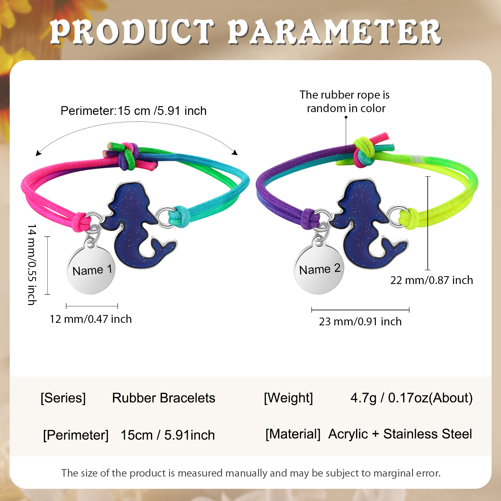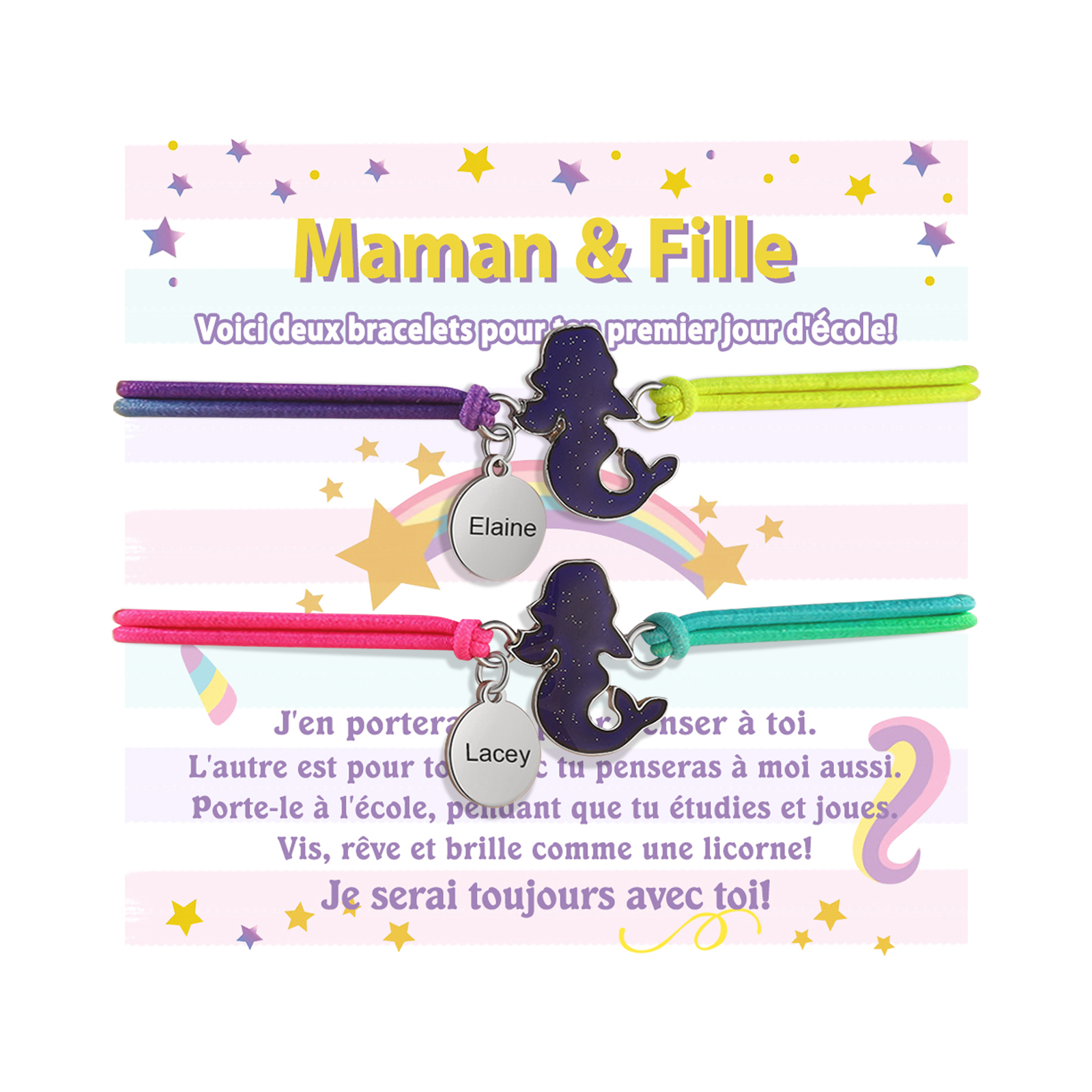 2PCS Ensemble de Bracelets Sirène 2 Prénoms Personnalisés Corde élastiques - Cadeau Rentrée Scolaire