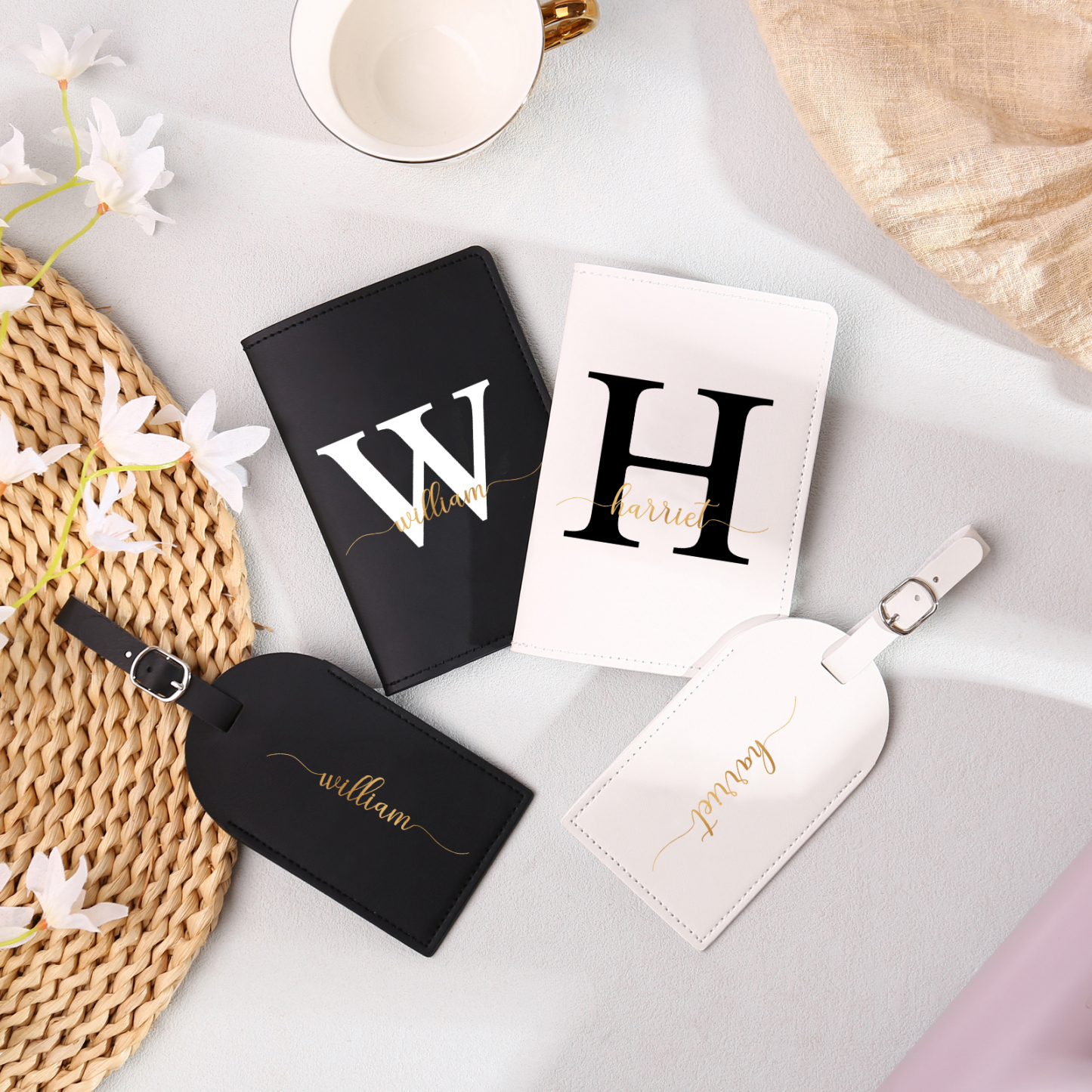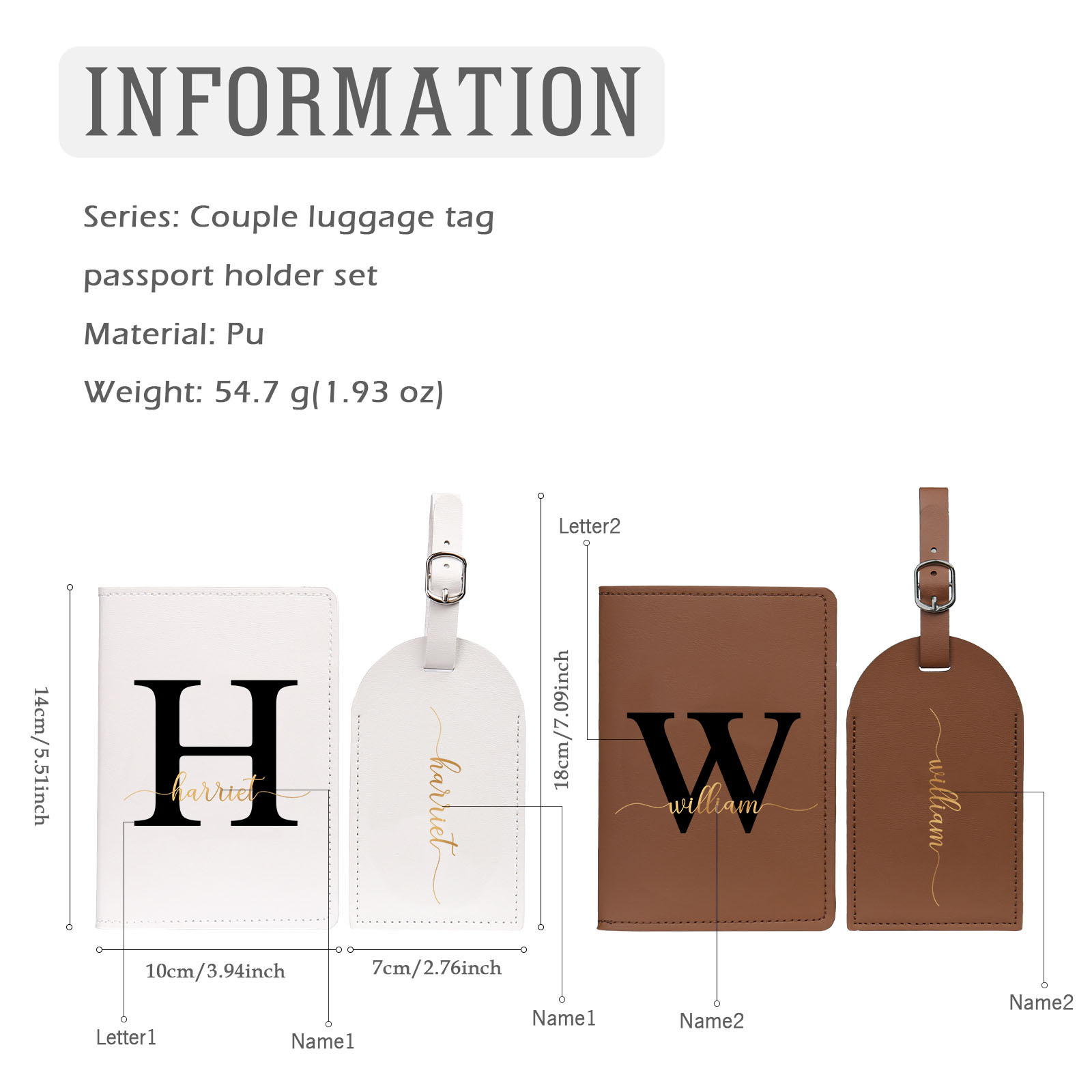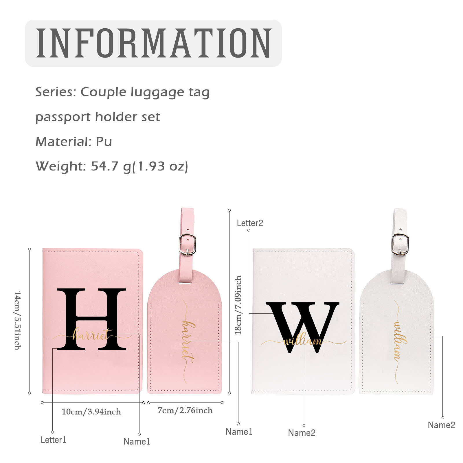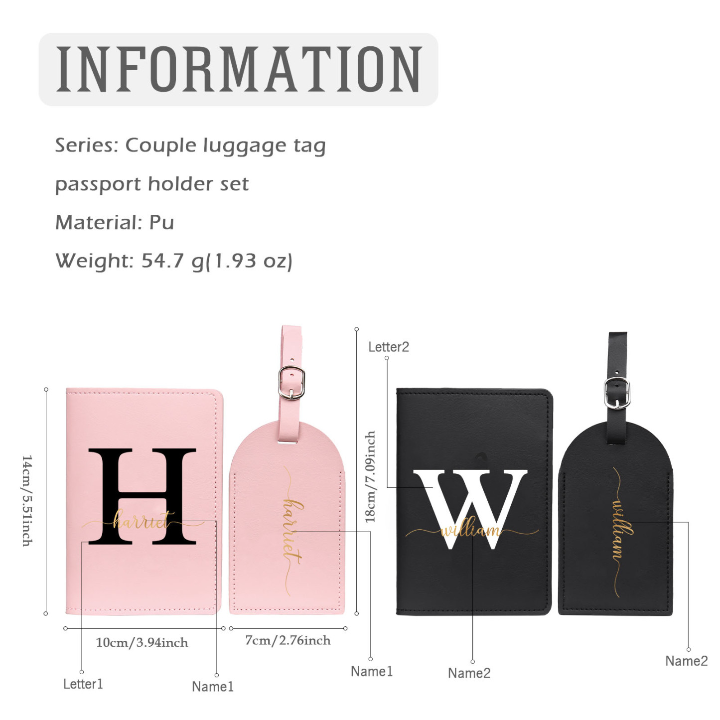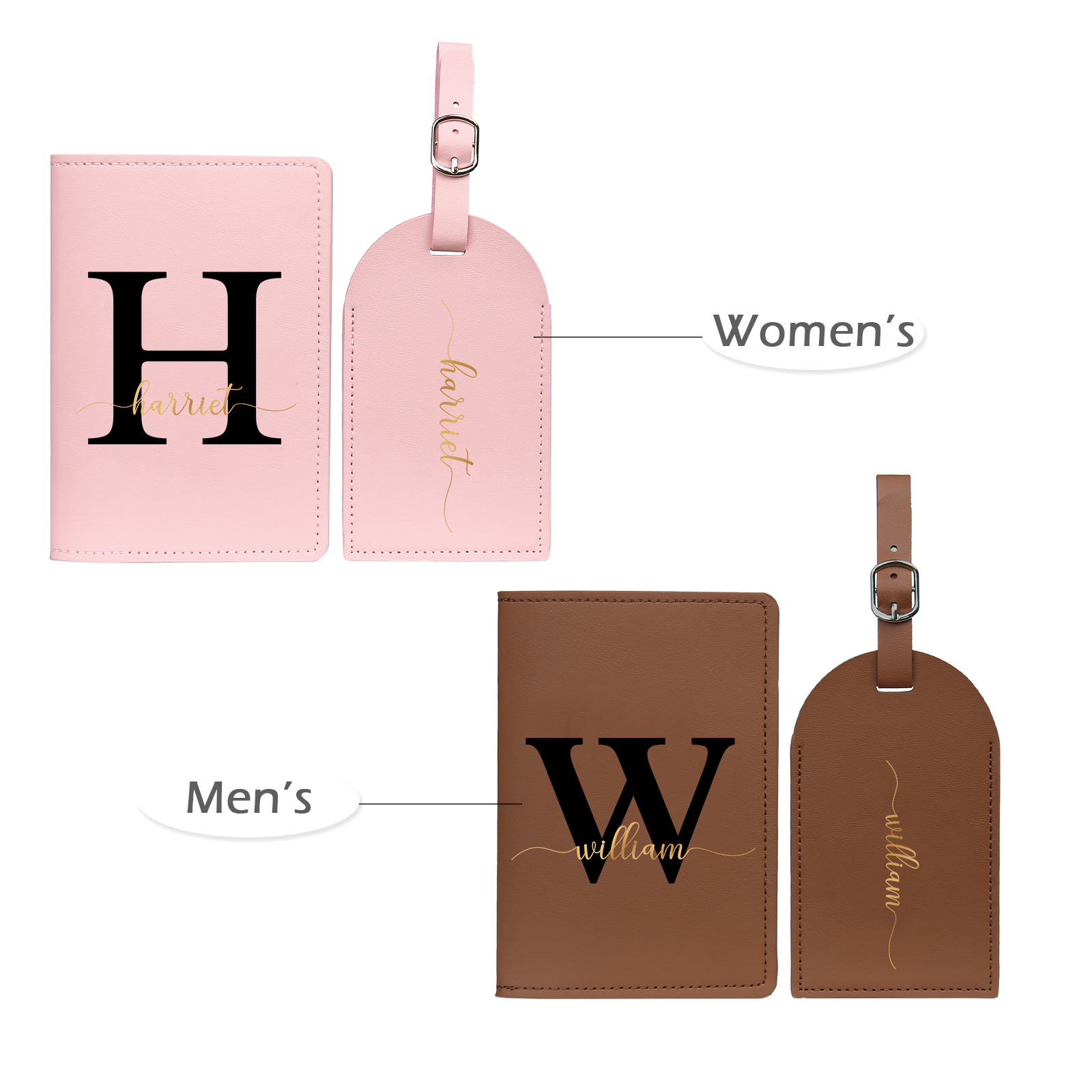 4 PCS Couple Mode Porte-Passeport et Étiquette de Bagage 2 Prénoms et 2 Lettres Personnalisés