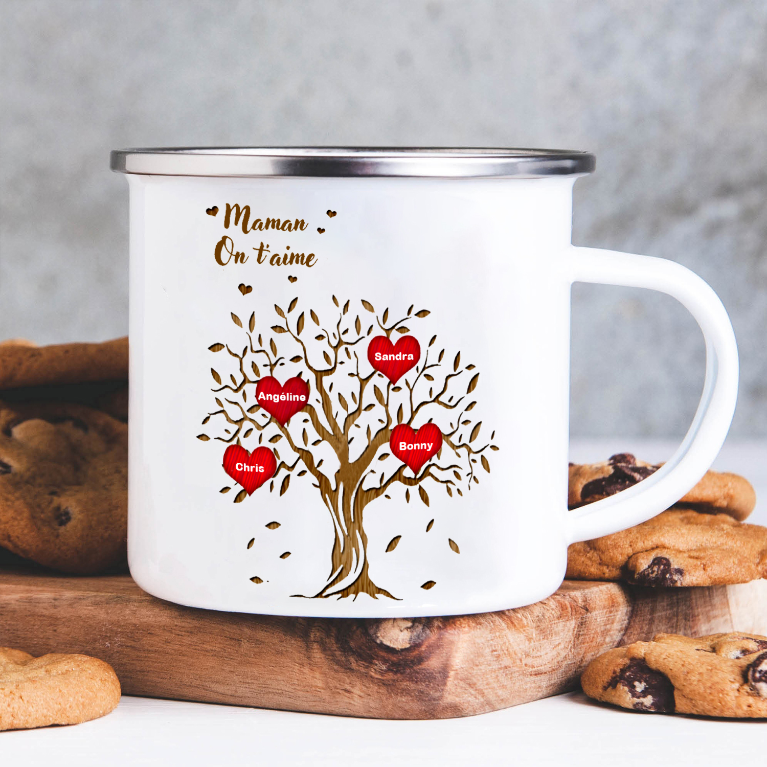 À Ma Maman/Mamie - Tasse émaillée d'Arbre de vie 4 Prénoms Personnalisés