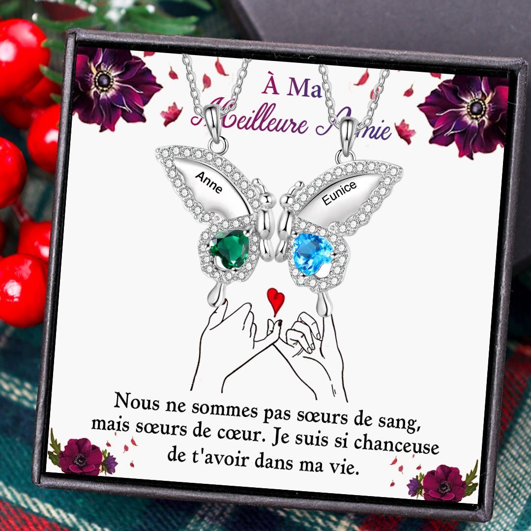 À Ma Meilleure Amie - 2PCS Collier Pendentif Papillon 2 Prénoms Personnalisés avec 2 Pierres de Naissance