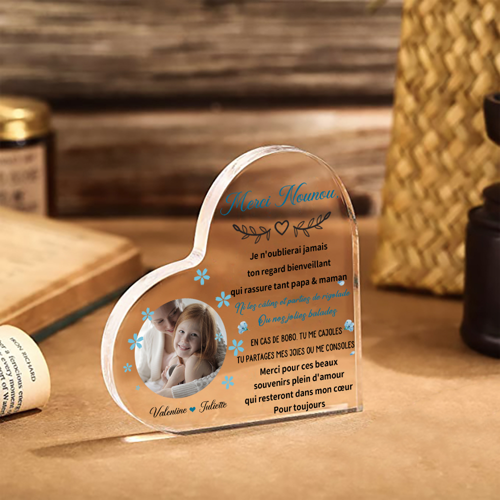 À Ma Nounou - Plaque Acrylique en Forme de Cœur 2 Prénoms Personnalisés avec Photo