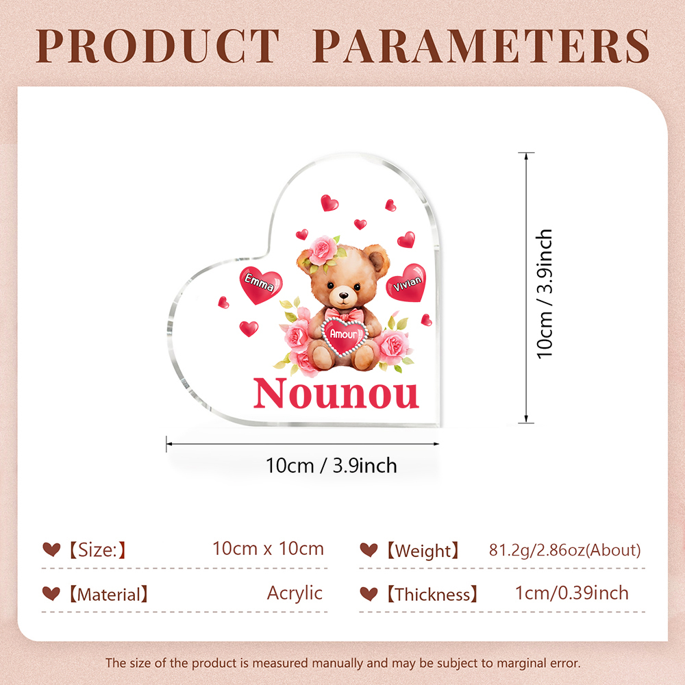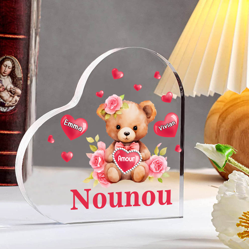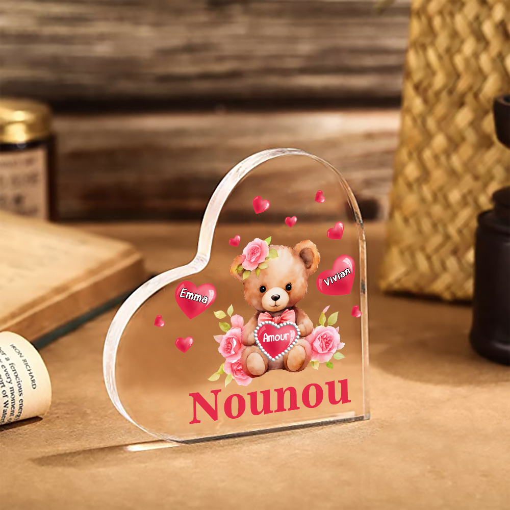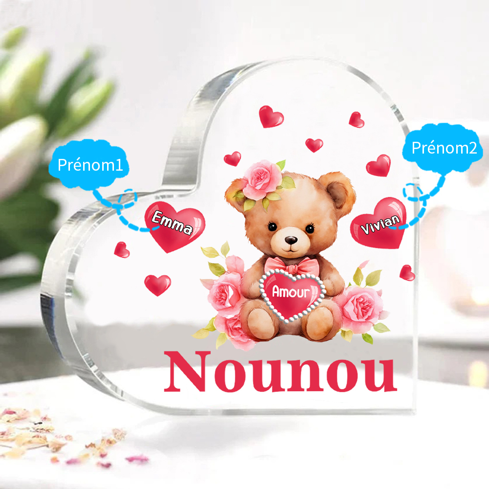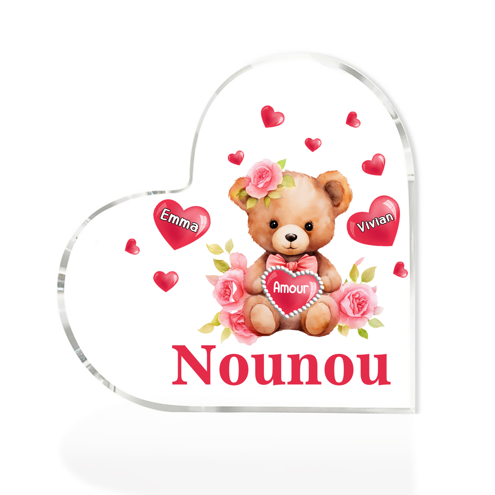 À Ma Nounou- Plaque Acrylique Ours en Forme de Cœur 2 Prénoms Personnalisés