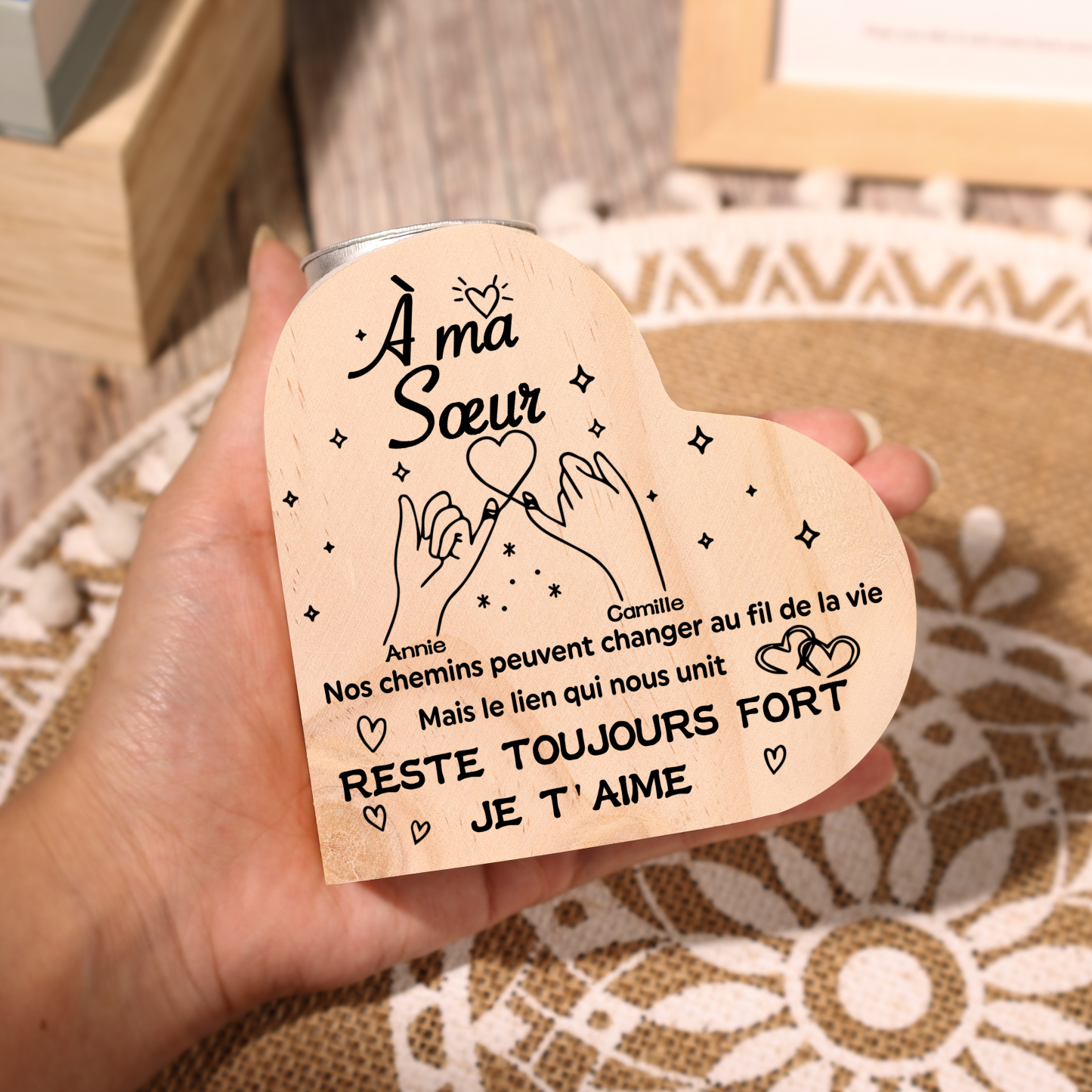 À Ma Sœur - Bougeoir en Bois 2 Prénoms Personnalisés sans bougie