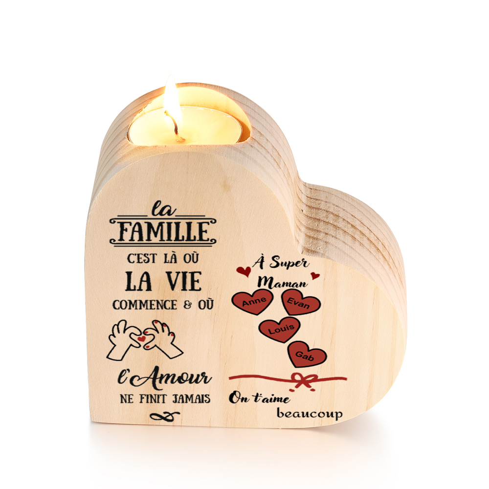 À Maman -Bougeoirs Cœur en Bois 4 Prénoms Personnalisés sans bougie