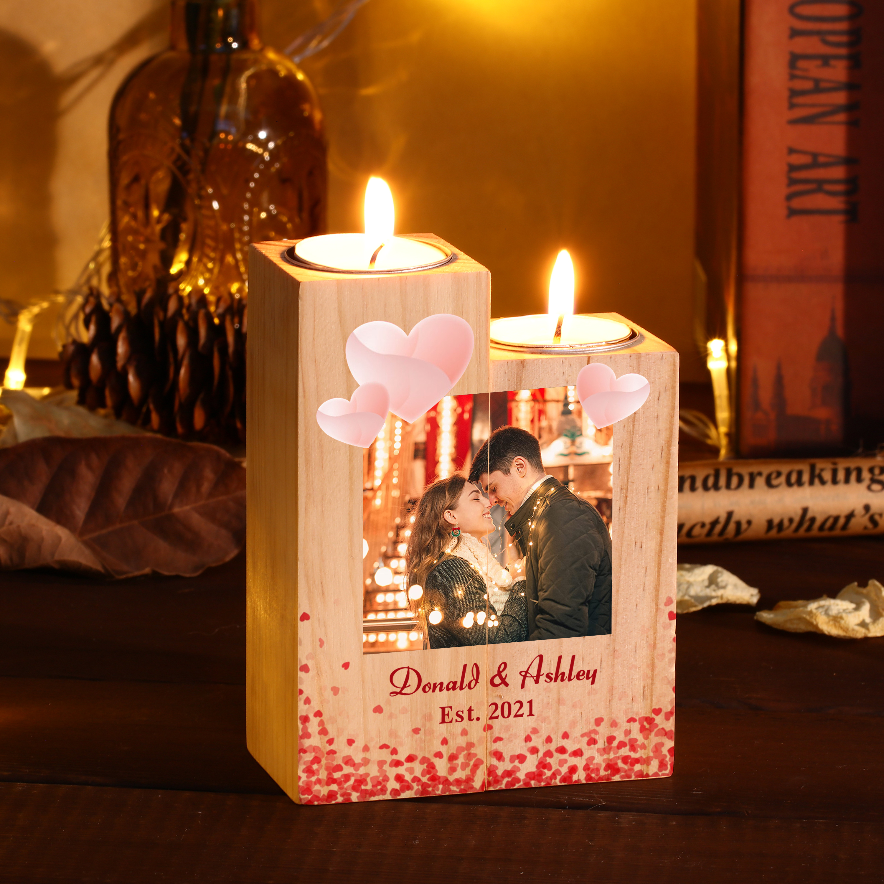 Bougeoir en Bois sans bougie texte personnalisé avec années et photo