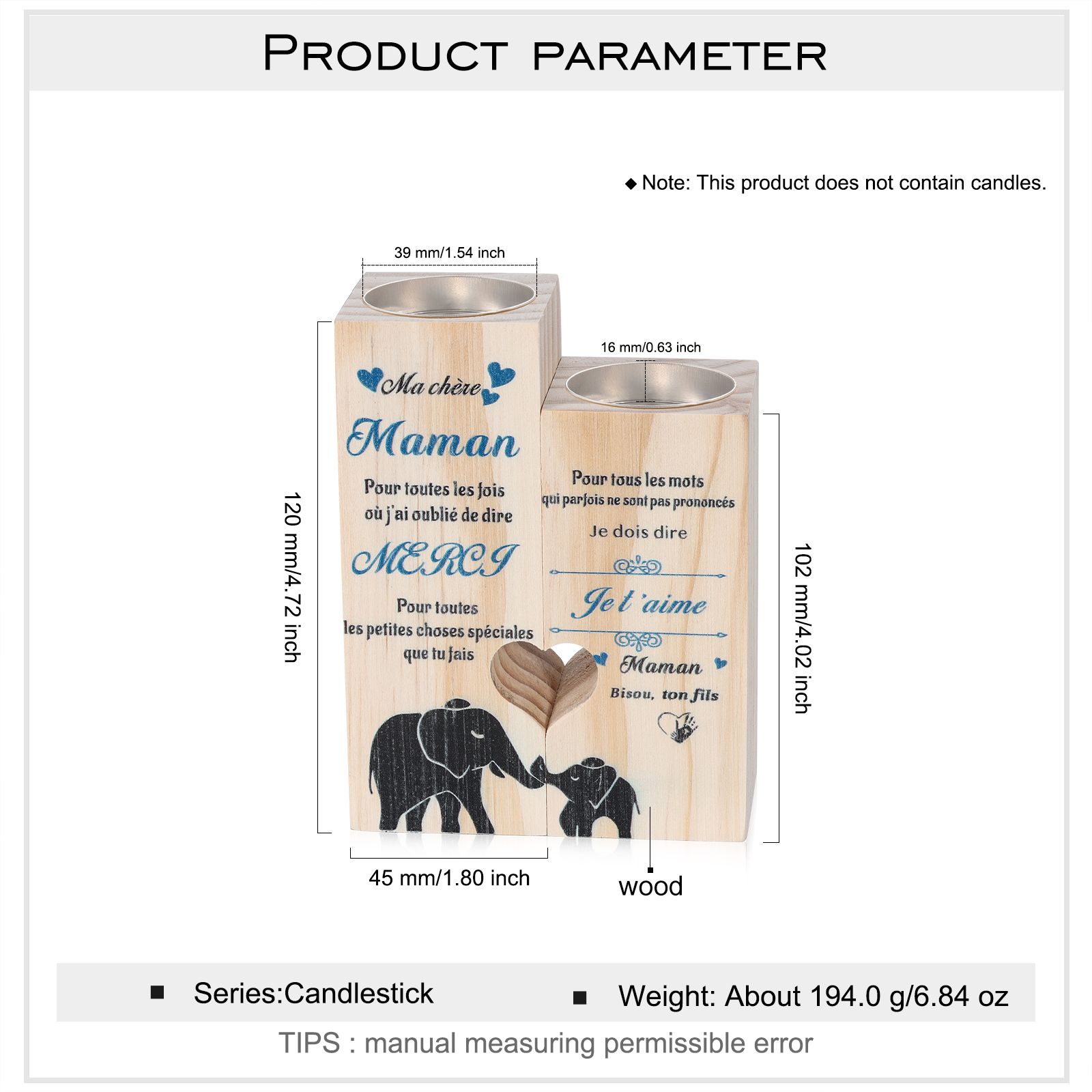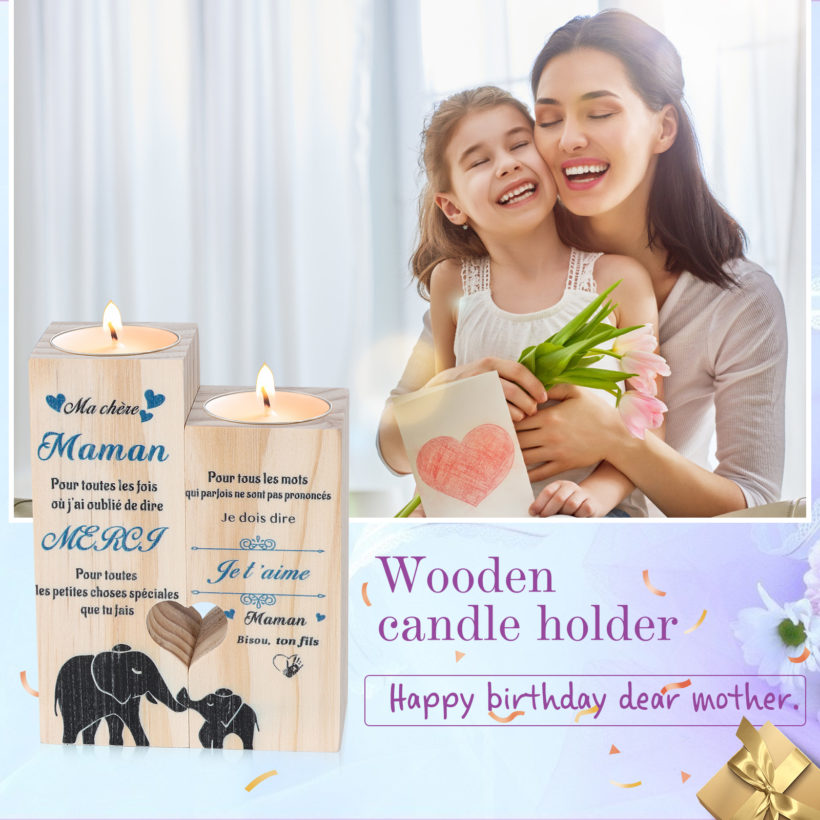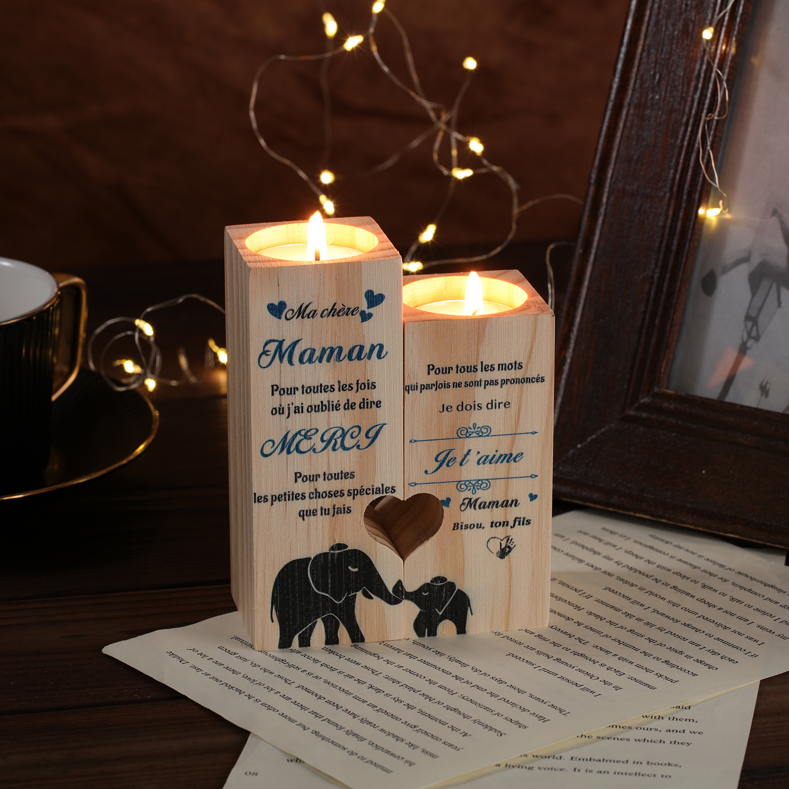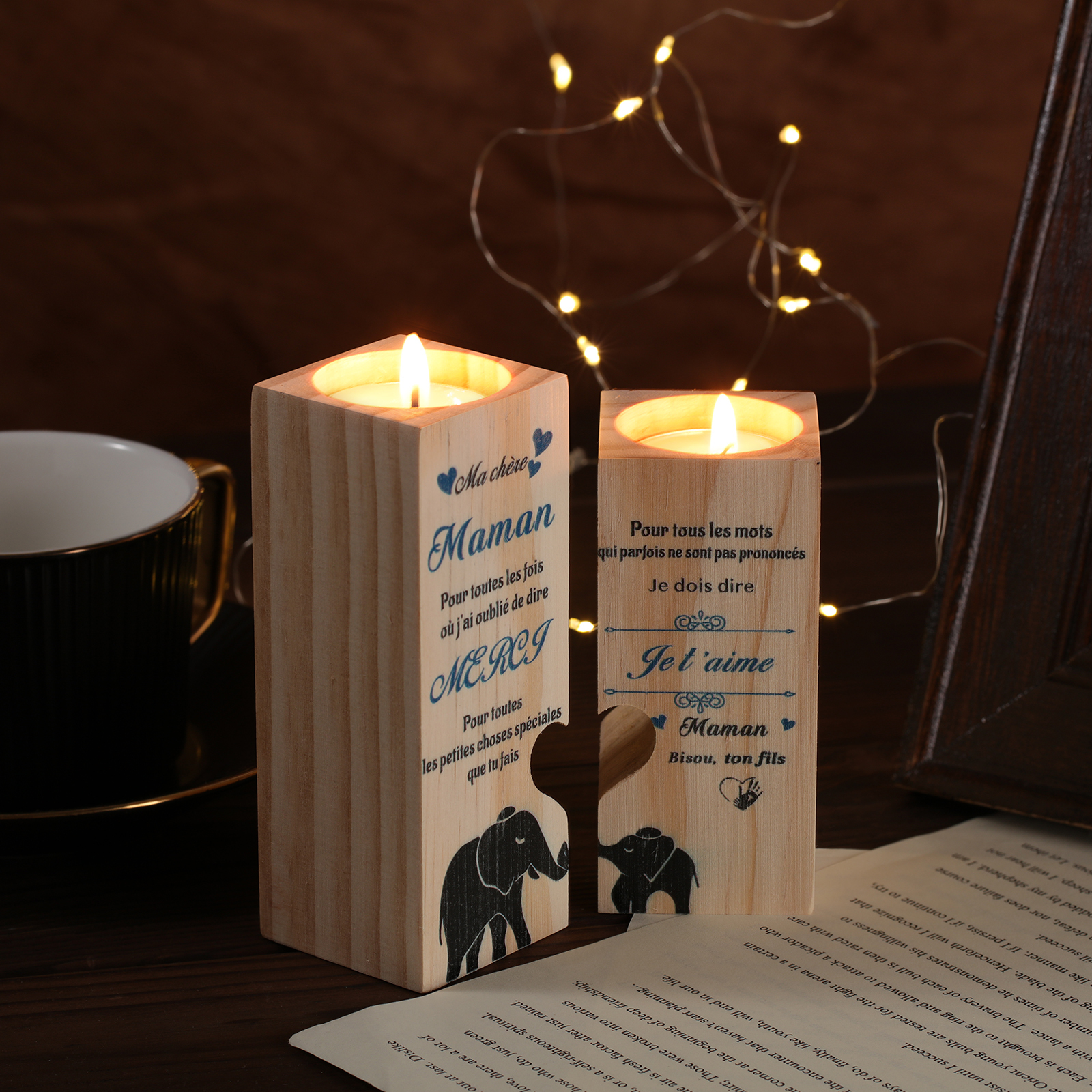 Bougeoirs en Bois 2PCS sans bougie Fils A Ma chère Maman