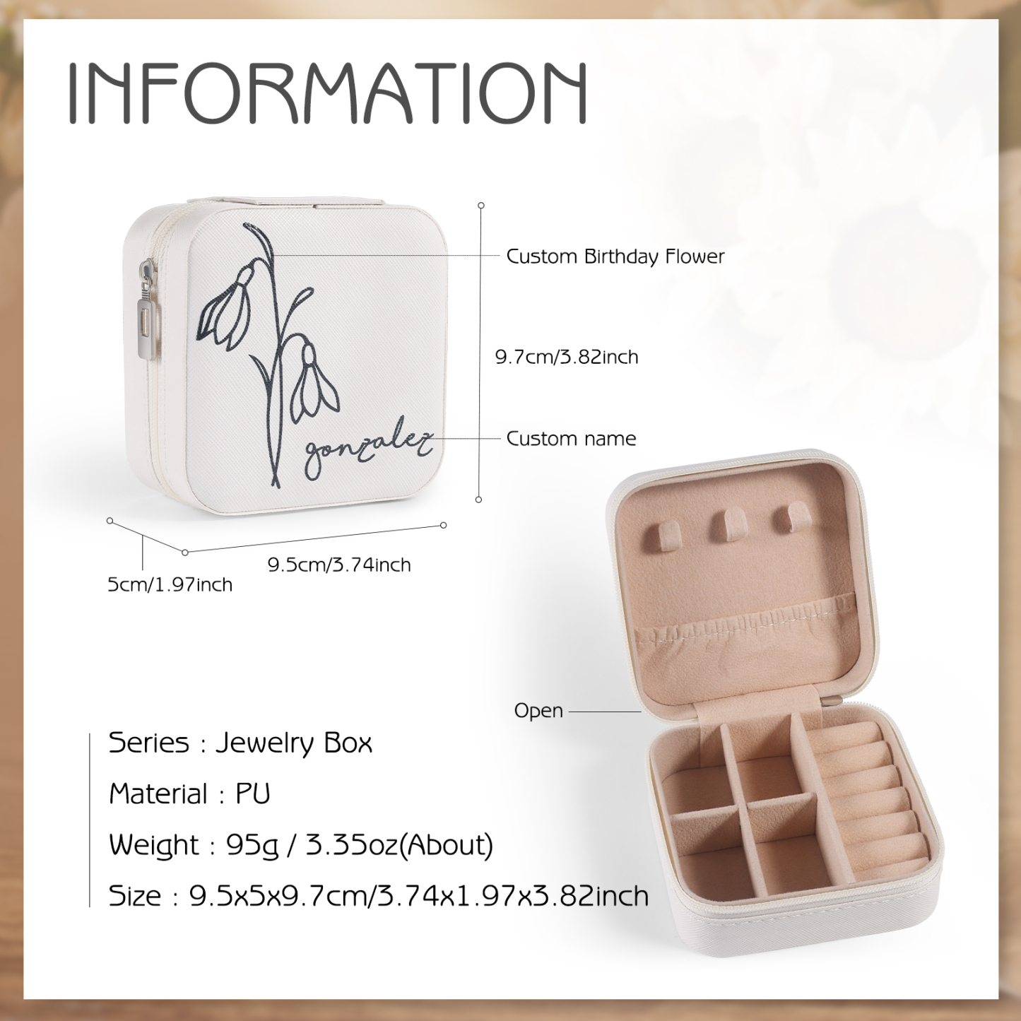 Boîte à Bijoux Prénom Personnalisé avec Fleur de Naissance
