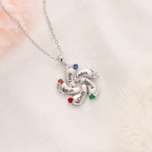 Collier 5 Prénoms Personnalisés Pieds de Bébé avec 5 Pierres de Naissance