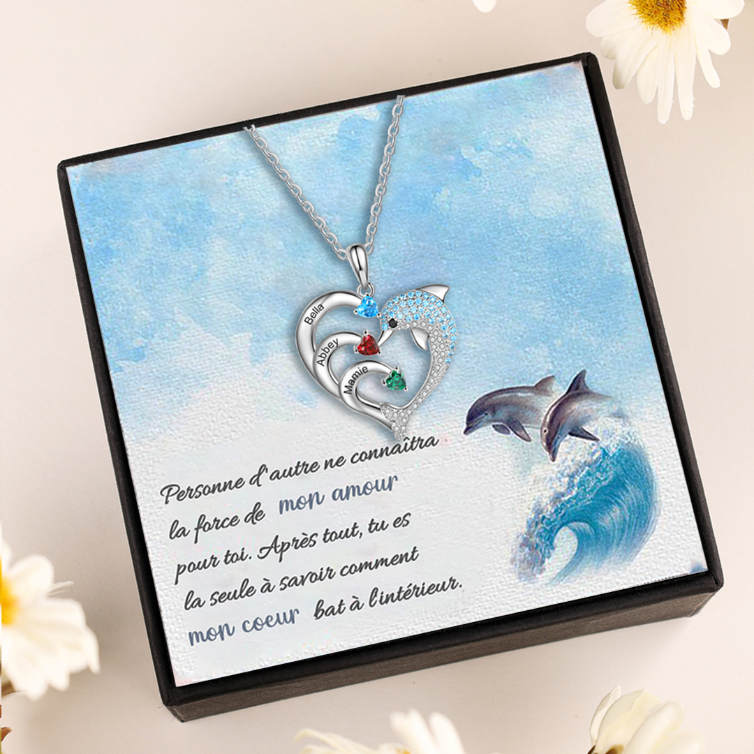 Collier coeur et dauphin 3 Prénoms Personnalisés avec 3 Pierre de Naissance