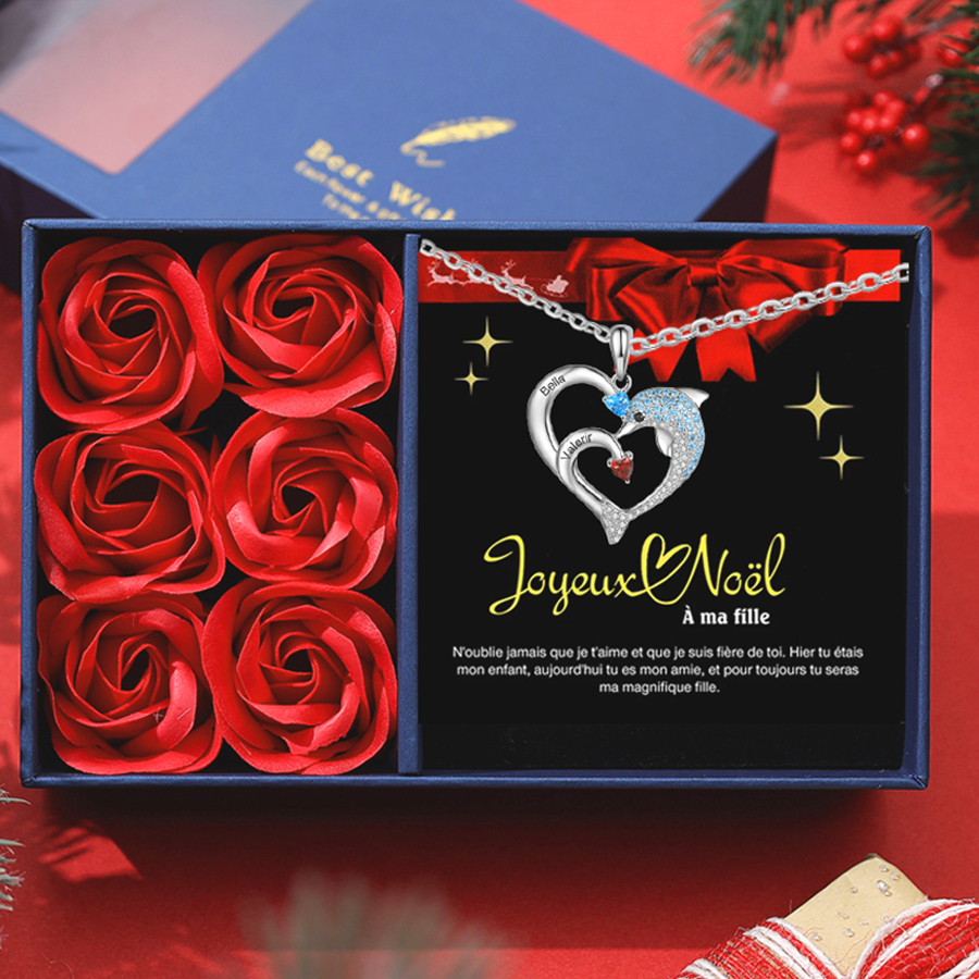 Collier de Noël Cœur et Dauphin 2 Prénoms Personnalisés avec 2 Pierres de Naissance
