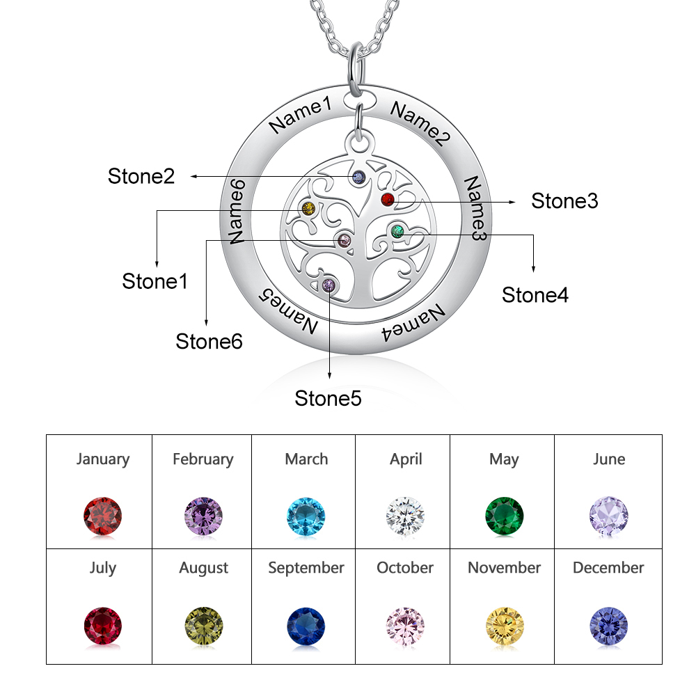 Collier Pendentif Arbre de vie Arbre généalogique 6 prenoms Avec Pierre De Naissance