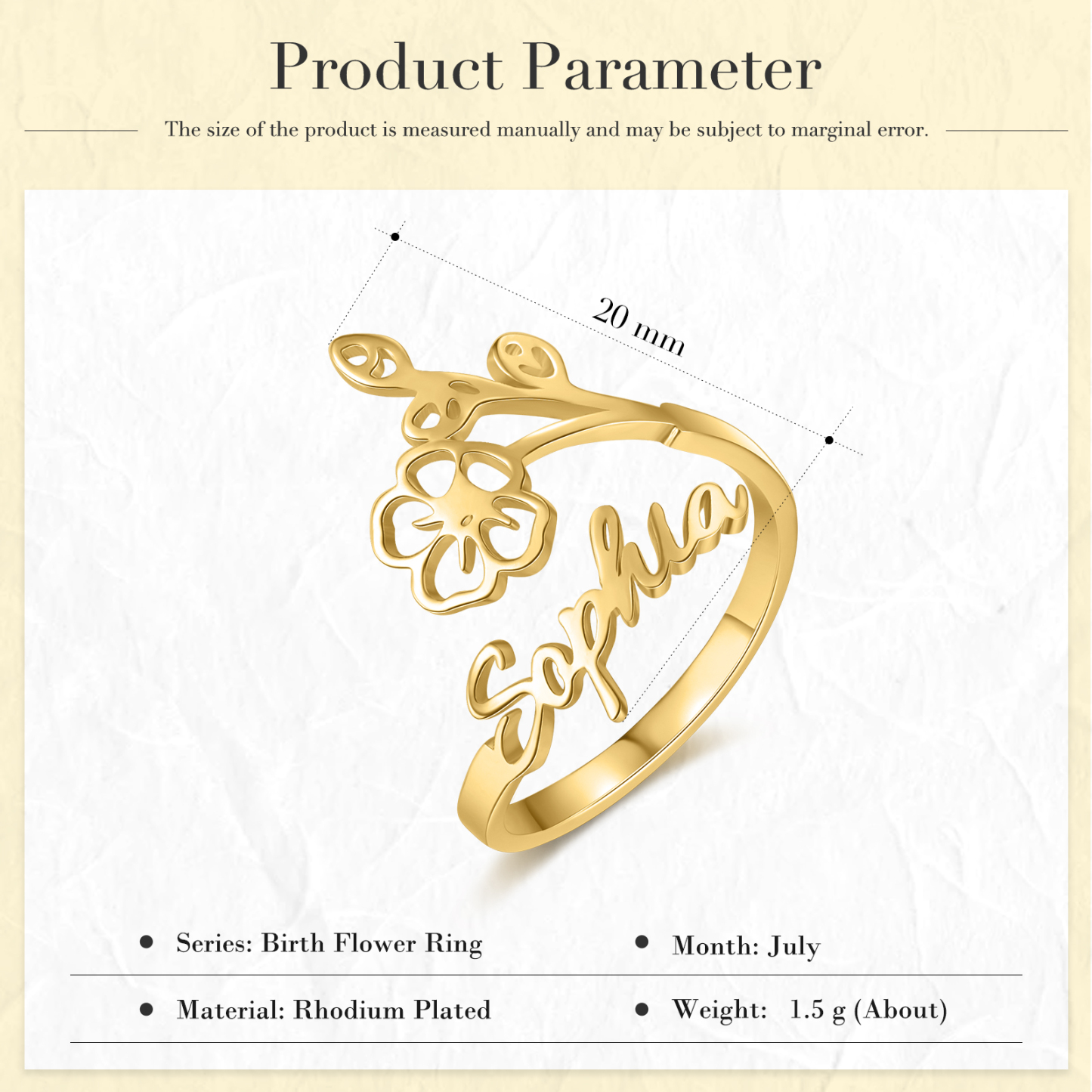 Juillet Bague Ajustable prénom personnalisé fleur de naissance