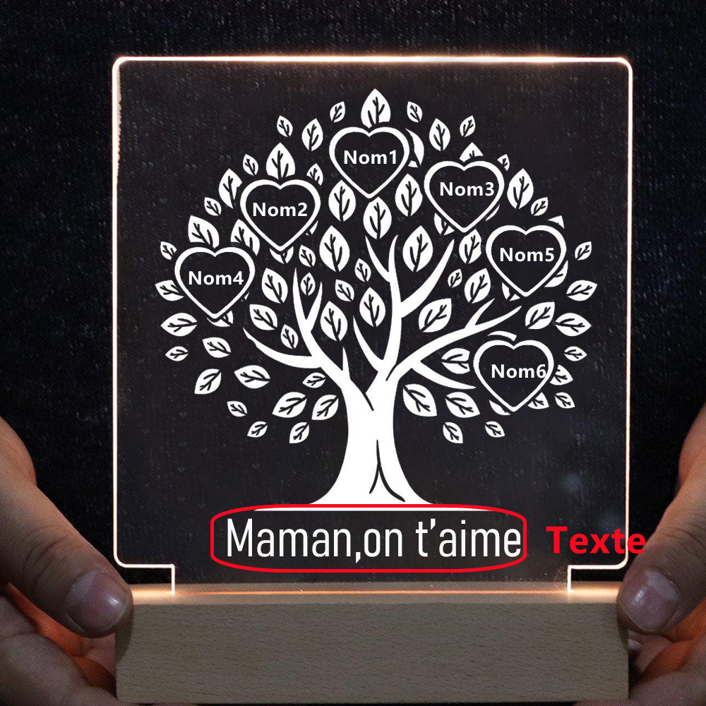 Lampe de chevet LED Arbre de vie Arbre généalogique 6 prénoms personnalisée avec texte