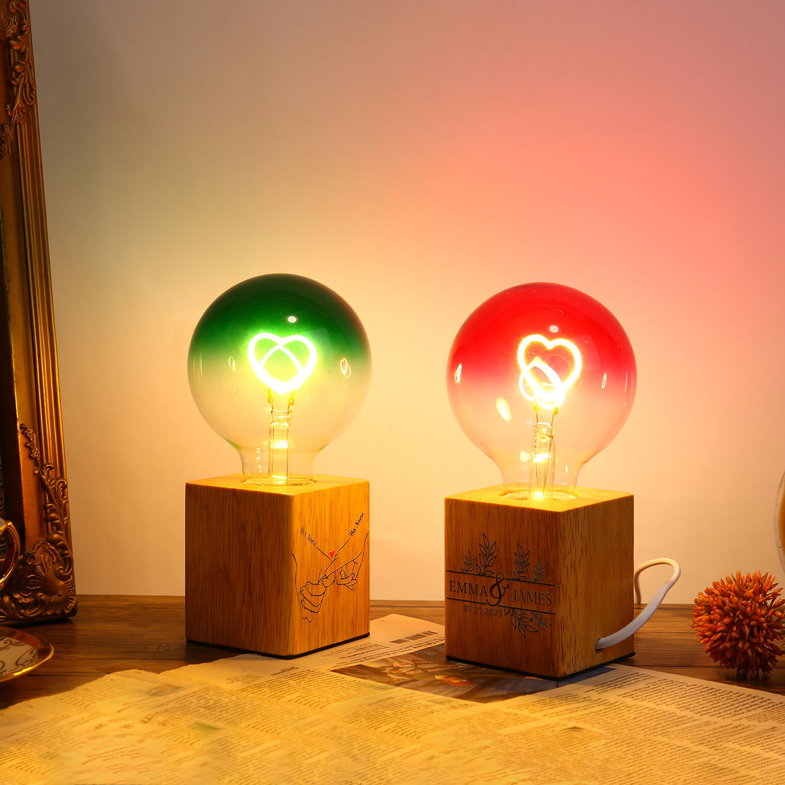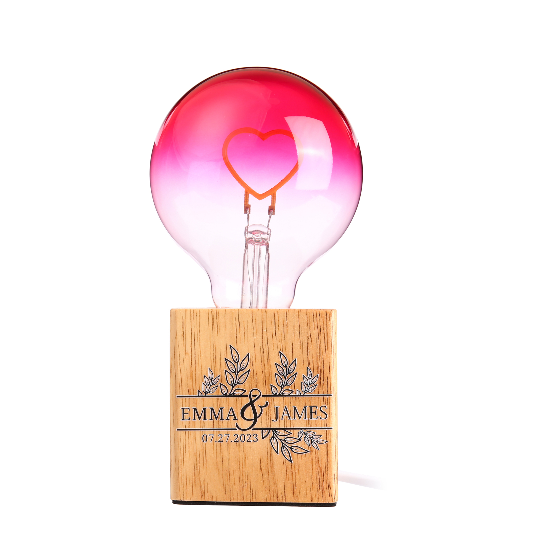 Lampe de Table Ampoule LED 2 Prénoms Personnalisés avec Date Filament en forme de Cœur pour Couple