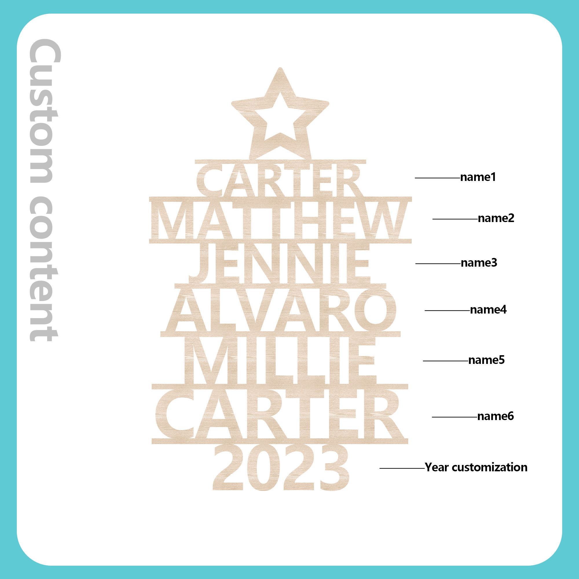 Décoration Sapin Noël en bois 6 Prénoms Personnalisés avec Année