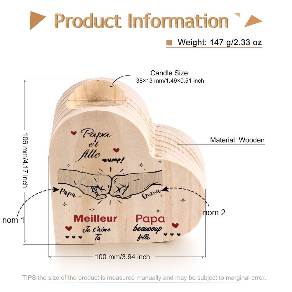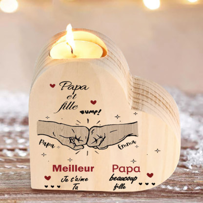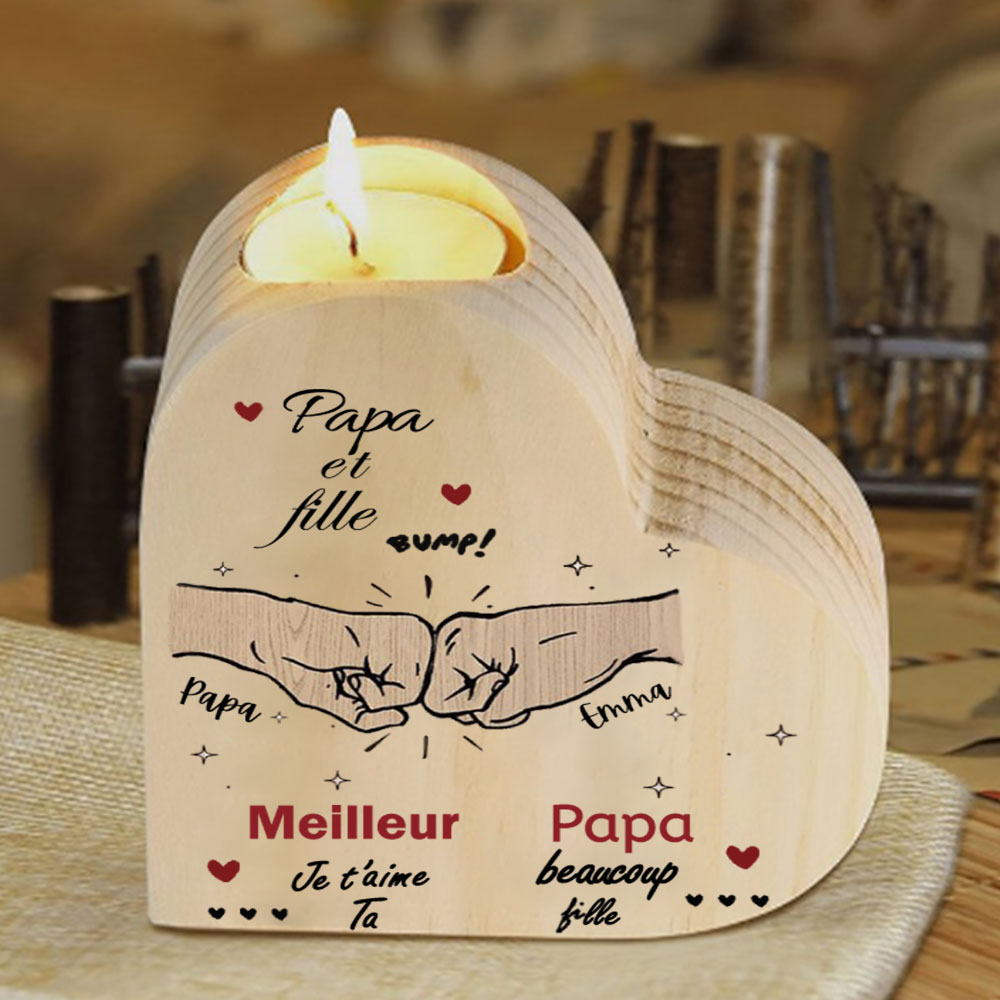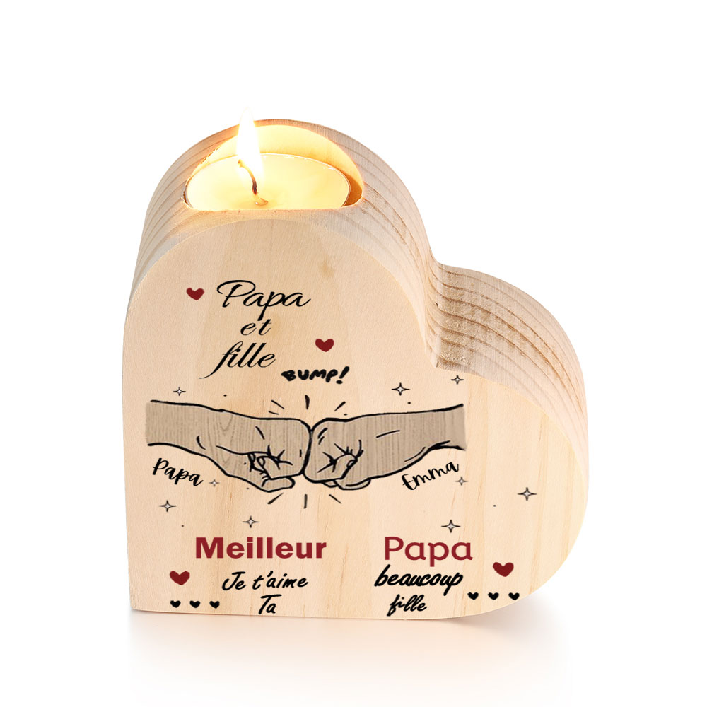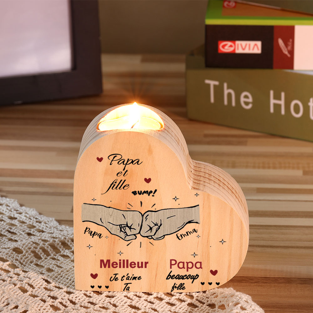 Papa et fille - Bougeoir Poings personnalisé en forme de coeur en Bois sans bougie 3 Prénoms Personnalisés