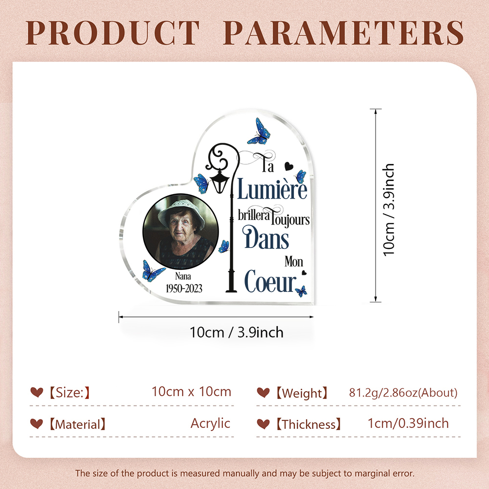 Plaque Acrylique Commémorative en Forme de Coeur Plaque Funéraire 1 Prénom Personnalisé avec Années et Photo