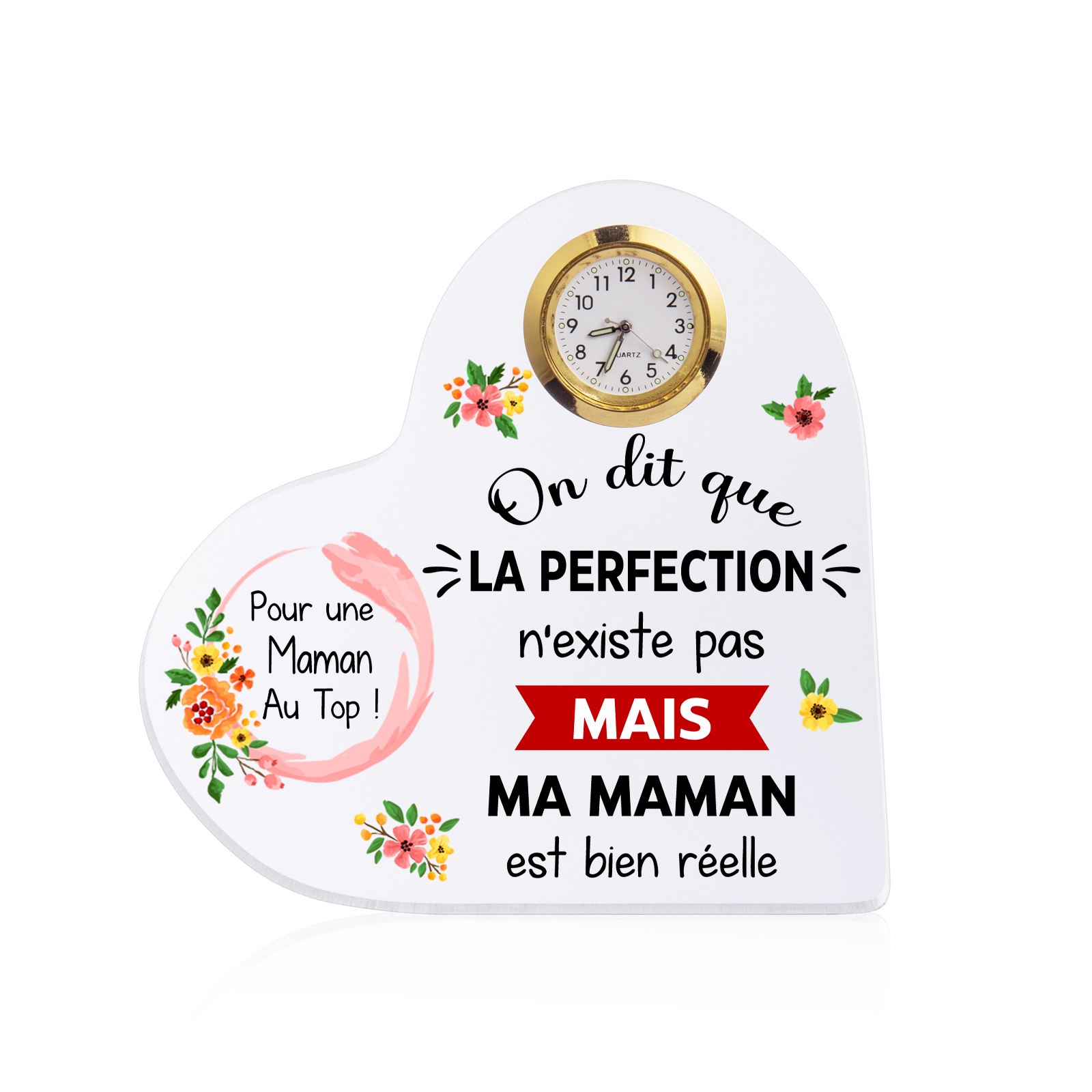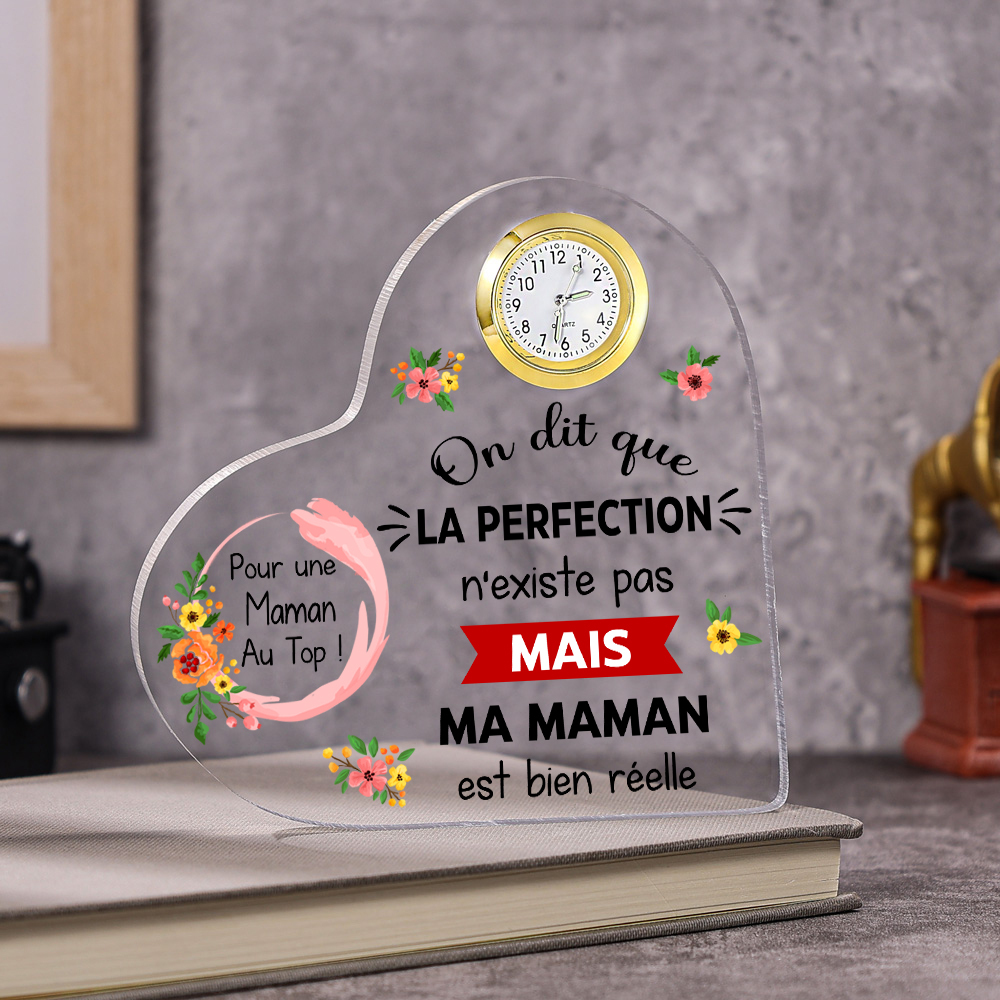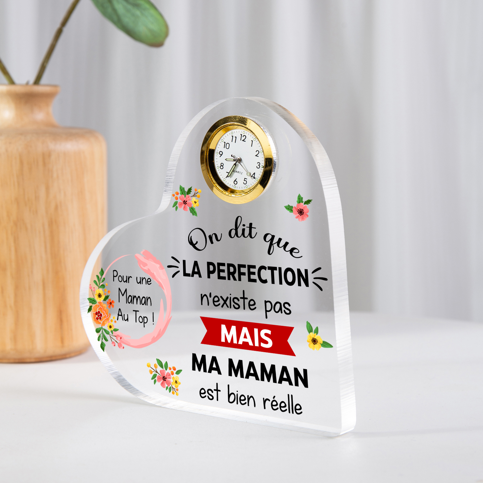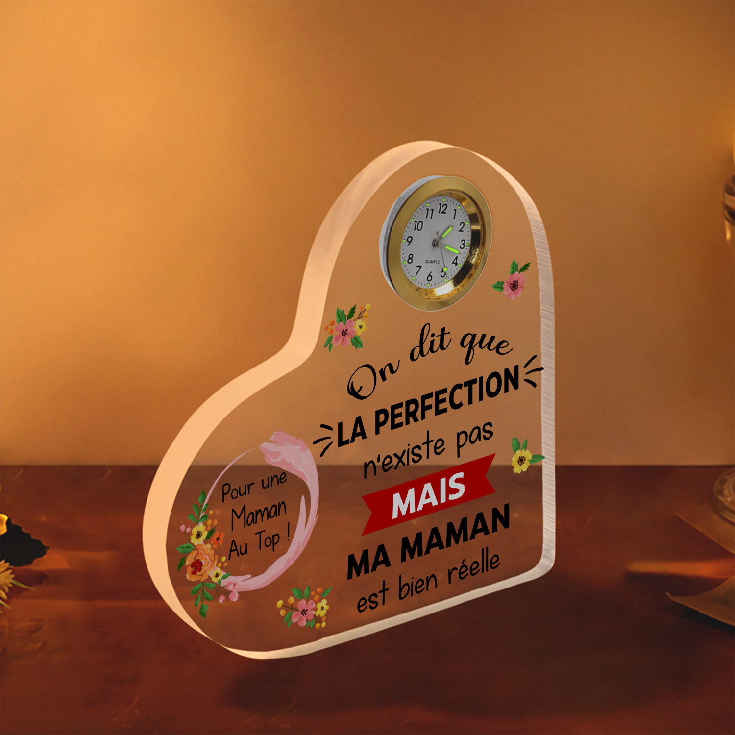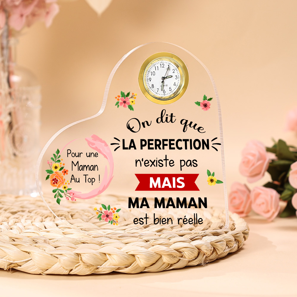 Plaque Acrylique en Forme de Coeur avec Horloge Fleur